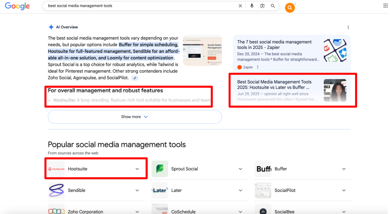 In fact, this video also appears in the AI overviews and you’ll see that Hootsuite happens to be the first product recommended: