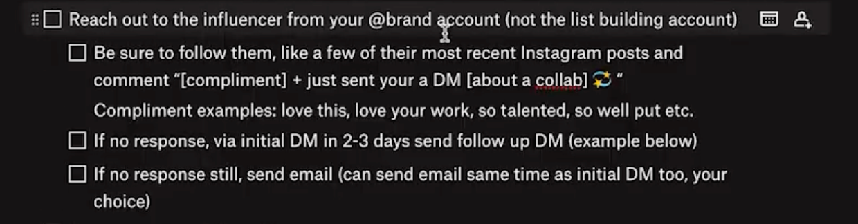 In her influencer marketing template, she recommends liking and commenting on several of the influencer posts from the brand account. Then she sends a DM and an email about a collaboration.