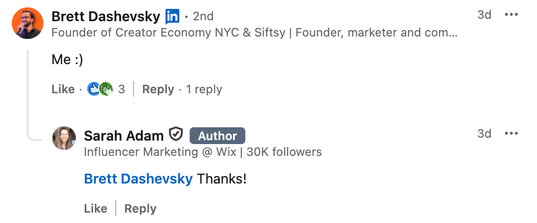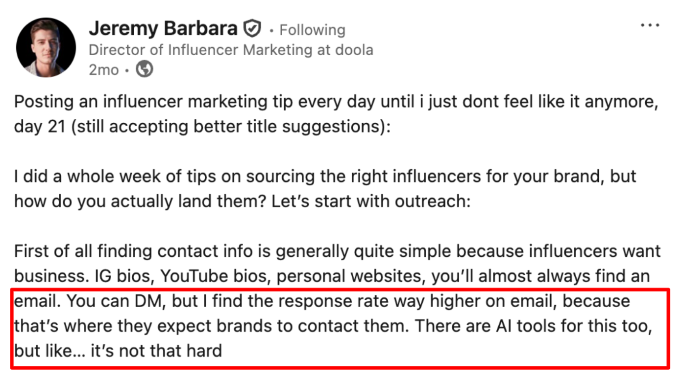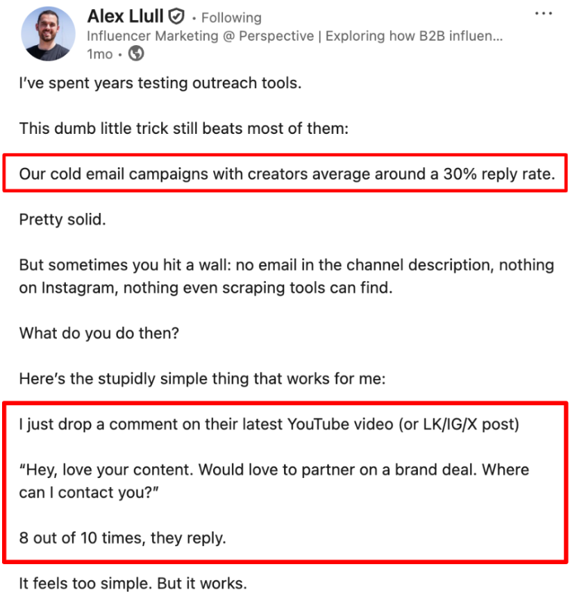 First, comment on their content. This is a tip from Alex Llull at Perspective, and he says it has helped him earn an 80% response rate. This also helps you weed out creators who don’t engage with their audience.
