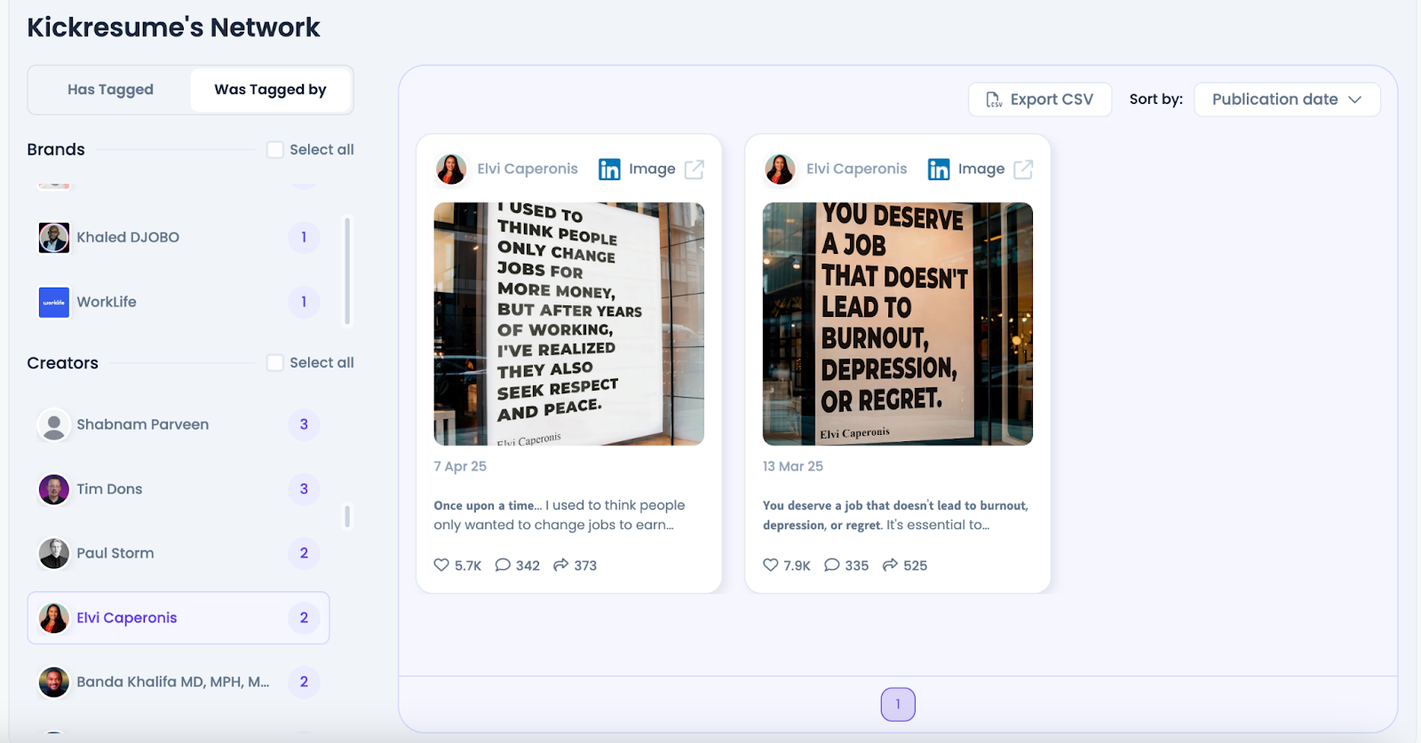 In this case, you could look at a brand like Kickresume and see all of the creators they’ve sponsored. Keep in mind that some of the creators may have organically tagged the brand, and some of the people who tagged the brand may work at the company.