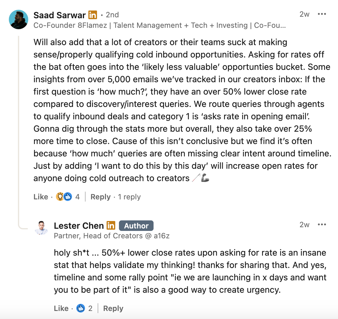 A study of over 5,000 email pitches to creators by Saad Sarwar (co-founder of a talent management agency) showed that emails asking creators for rates in the initial pitch had a 50% lower close rate.