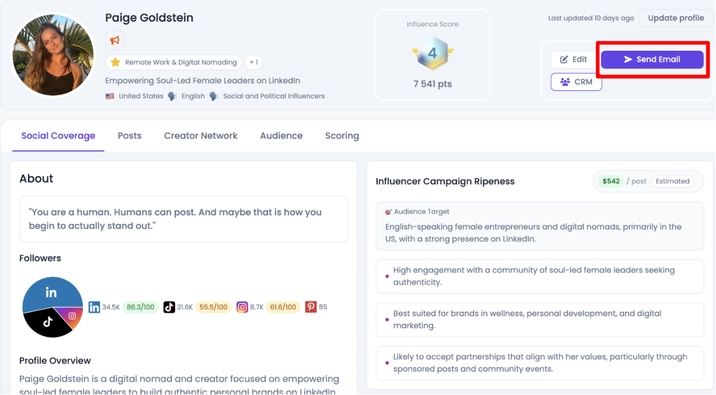 When it’s time to reach out to influencers, you can send them an email or a DM directly inside the platform as there’s an entire CRM in Favikon.
