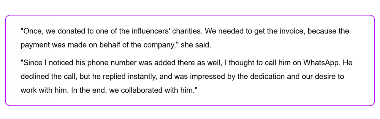 Even though the majority of an influencer’s income comes from brand deals, realize that their DMs are already flooded by their audience as well as other brands.