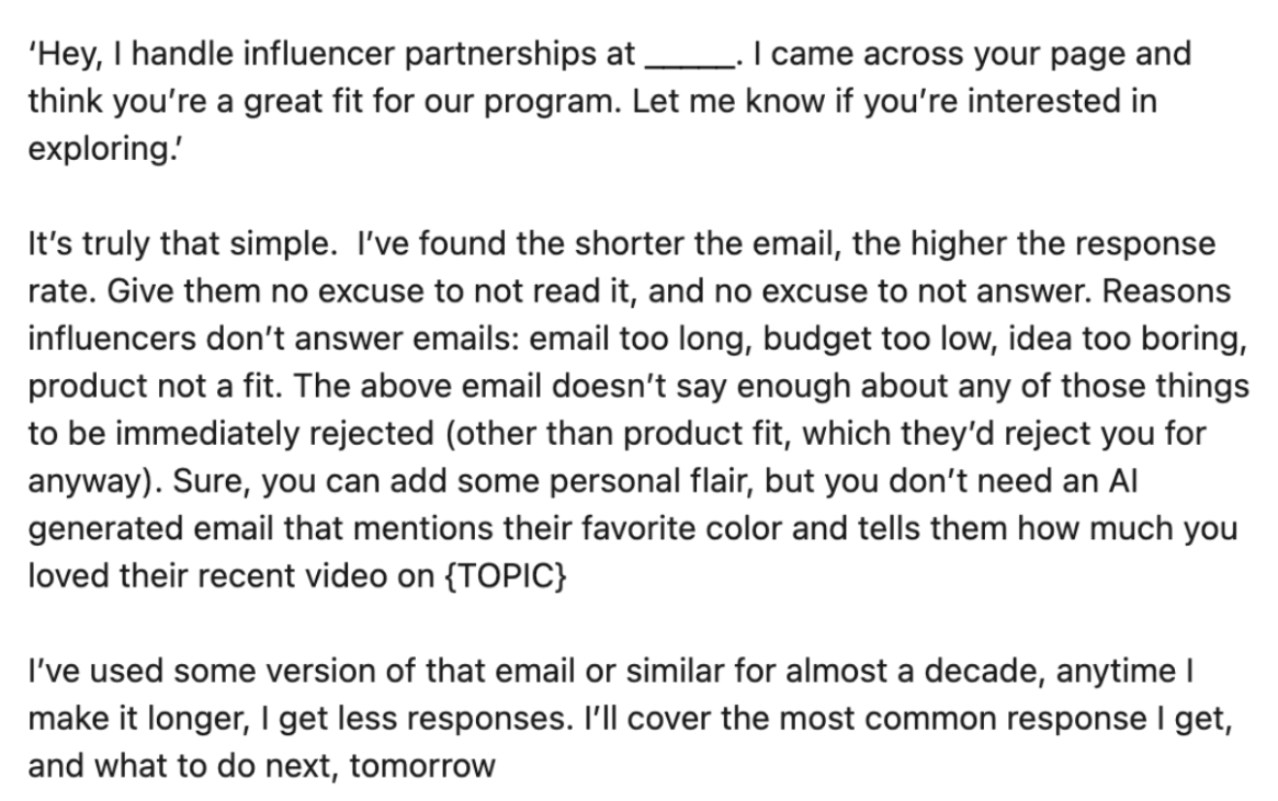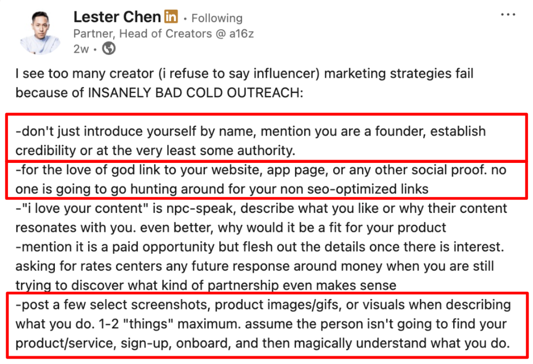 This comment was in response to the earlier post by Lester Chen, which outlined the key mistakes brands make when performing creator outreach.