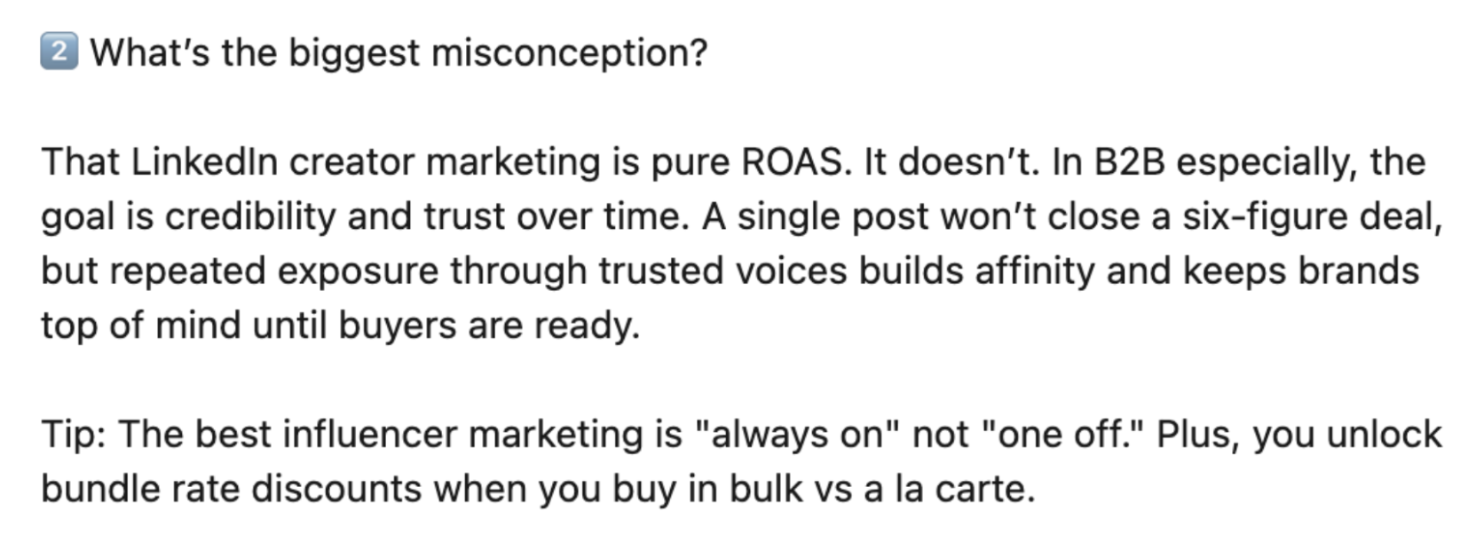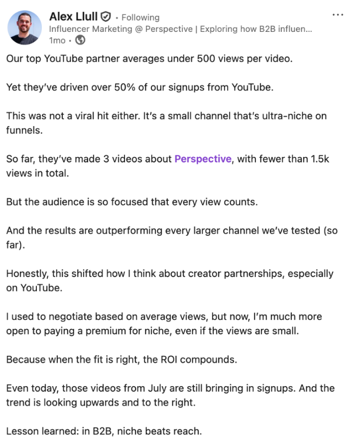 Unlike DTC influencer marketing, you can’t just offer a discount code and measure the efficacy of that influencer campaign based on the sales or demos booked the following week.