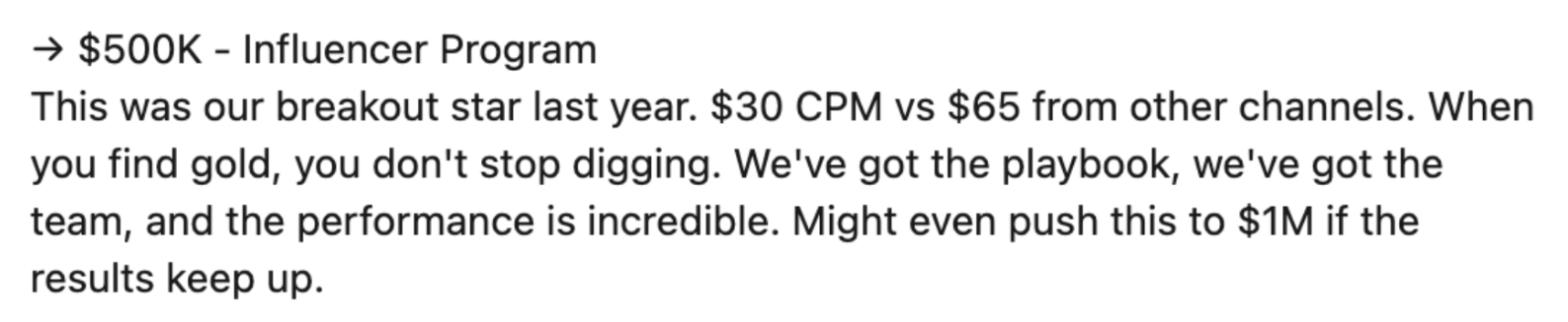For example, Storylane’s Head of Marketing cited CPM as the main marker of success in a detailed budget breakdown post: