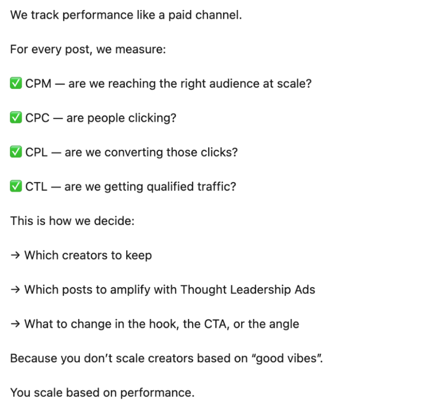 To calculate LinkedIn CPMs, you can ask your creators to take a screenshot of the post’s performance from their LinkedIn analytics dashboard.