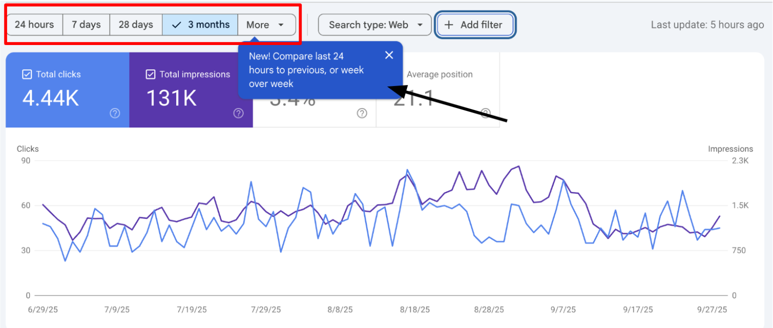 You can use Google Search Console to track total impressions of your brand’s keywords or search terms. From the Performance dashboard, you can filter down to the last 24 hours.