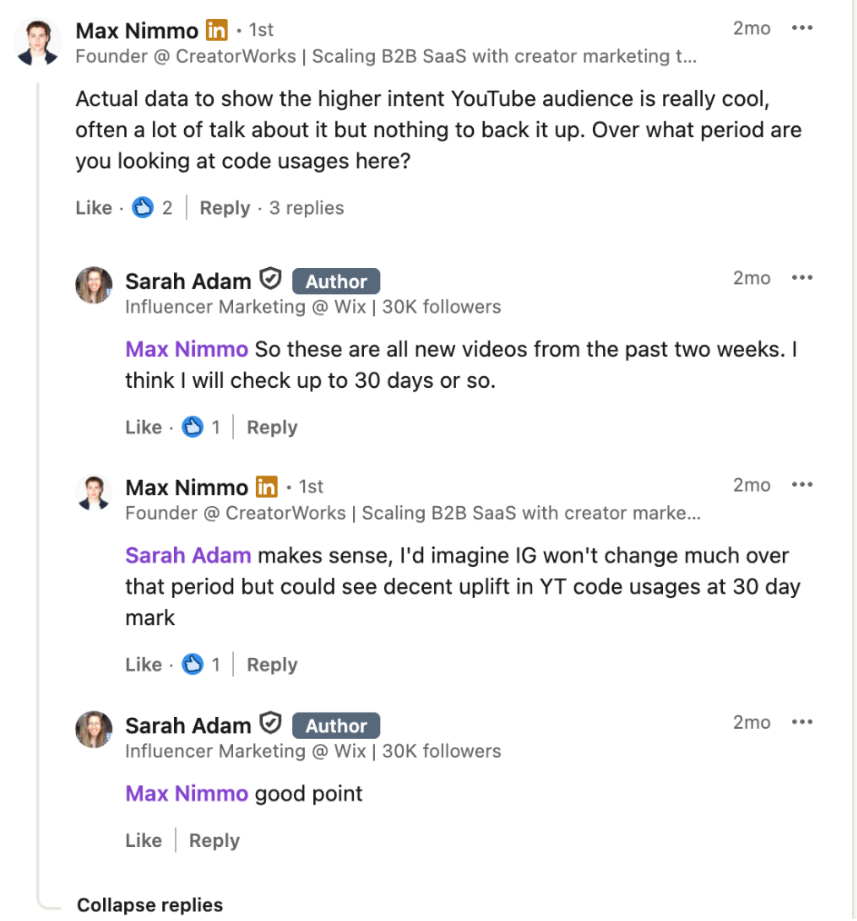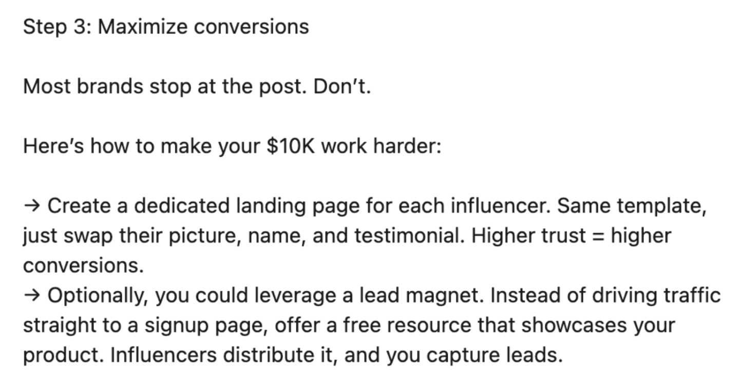 He elaborated in another post that he frequently creates a dedicated landing page for each influencer. If you have a long buying cycle or an enterprise product, consider offering a lead magnet.