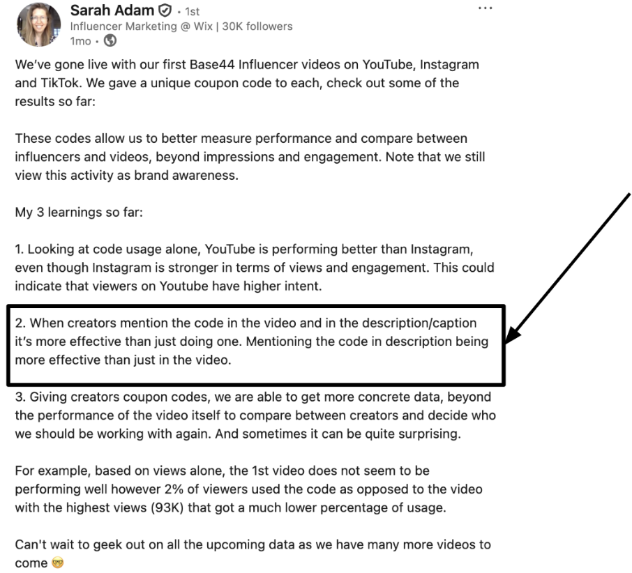 Sarah Adam mentioned that she saw best results if creators mentioned the discount code both verbally in the video and again in the description: