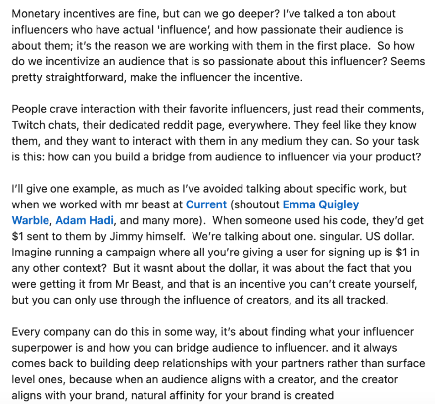 Jeremy explained that in one campaign with MrBeast, the incentive was MrBeast personally sending the audience member a dollar rather than providing a traditional coupon code.
