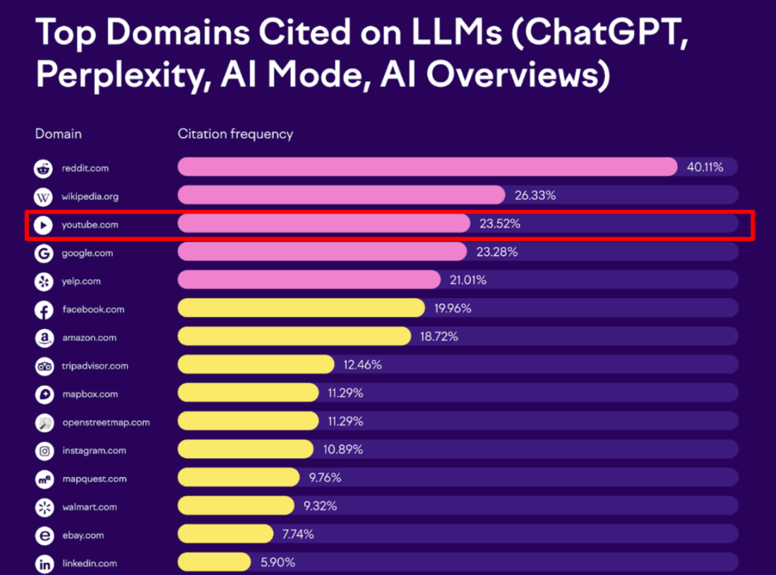 According to a study from Semrush, YouTube is the third most cited source in LLMs. This means that the more mentions you receive on YouTube from influencers, the more likely you are to increase brand visibility in LLMs like ChatGPT.