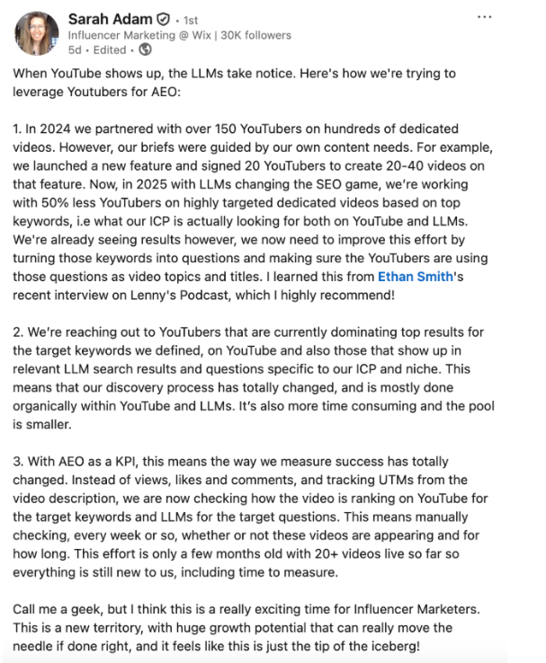 “We’re reaching out to YouTubers that are currently dominating top results for the target keywords we defined, on YouTube and also those that show up in relevant LLM search results and questions specific to our ICP and niche,” says Sarah.