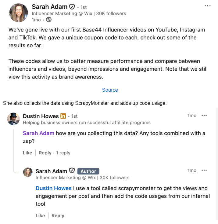Sarah Adam primarily uses coupon codes and impressions and engagement to measure the efficacy of Wix’s program: