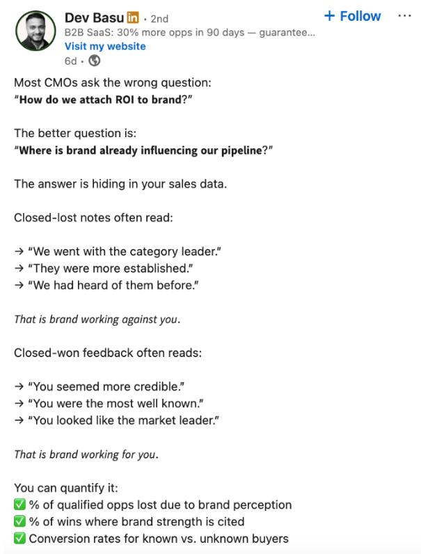 Branding factors are more difficult to measure, but one tip from B2B SaaS marketer, Dev Basu, is to look at your sales data and read through all of the closed-won and closed-lost reasons.