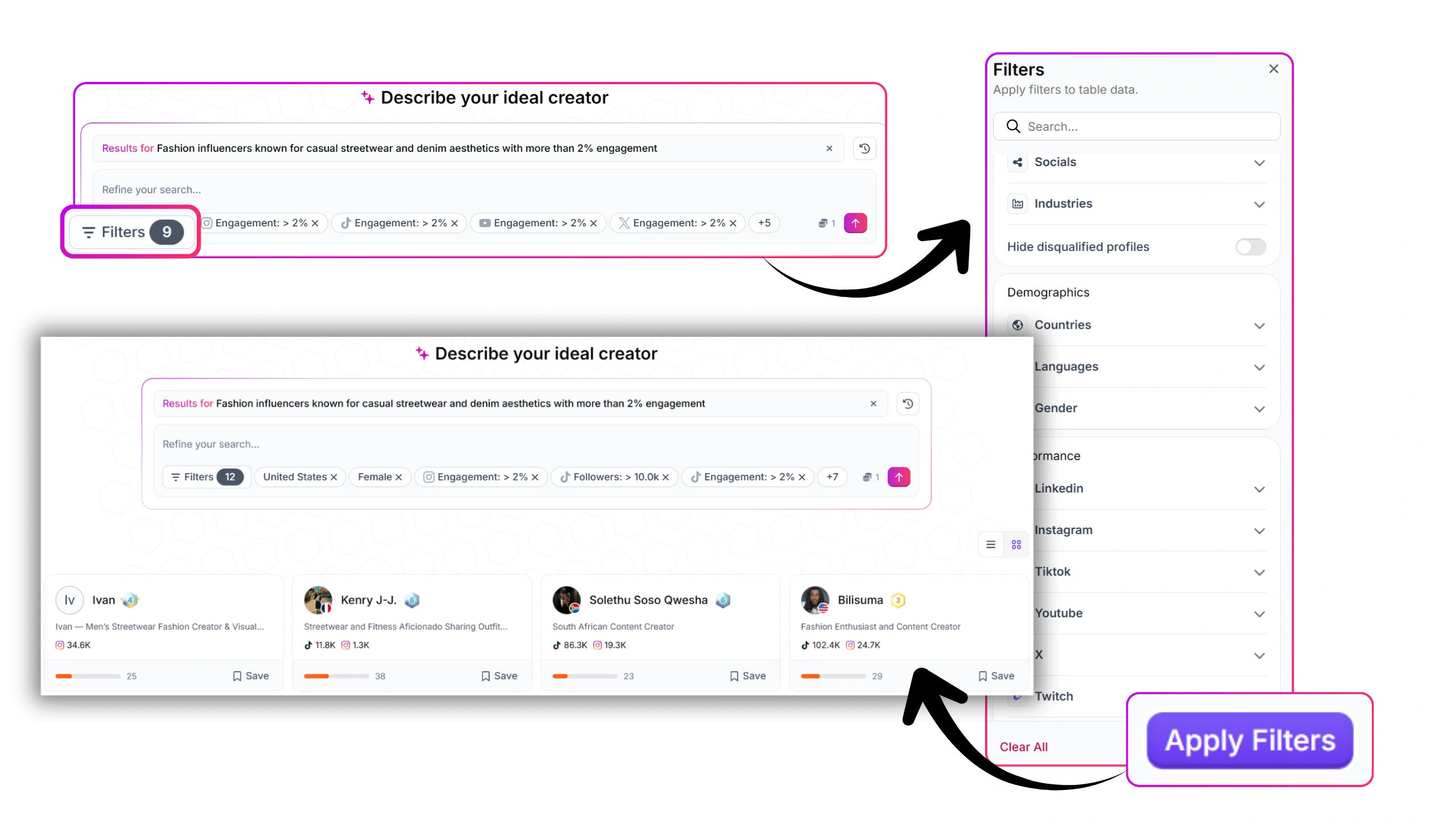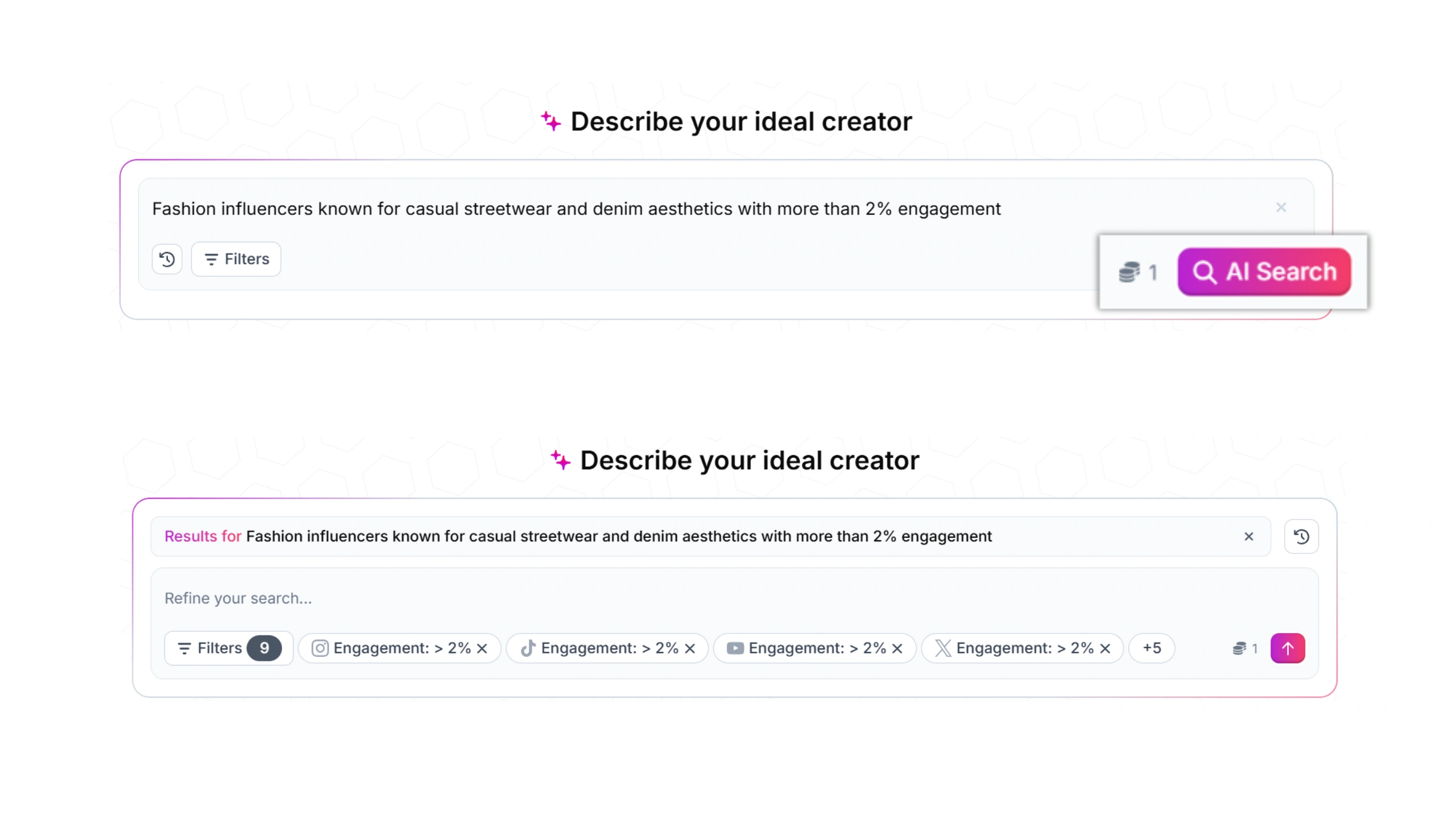 - Type naturally: "Fashion influencers known for casual streetwear and denim aesthetics with more than 2% engagement"