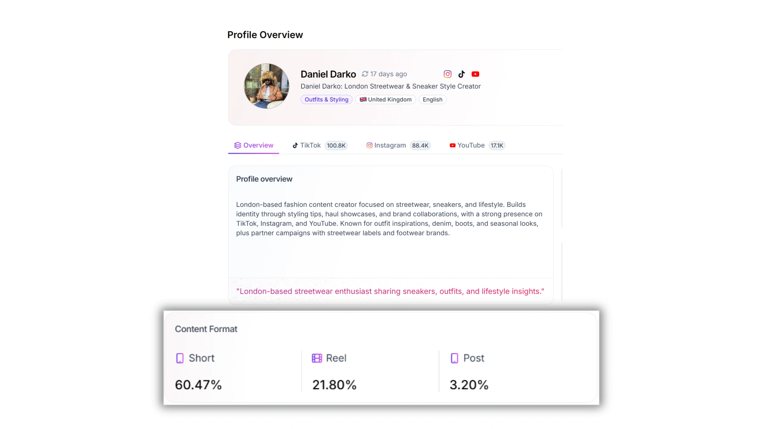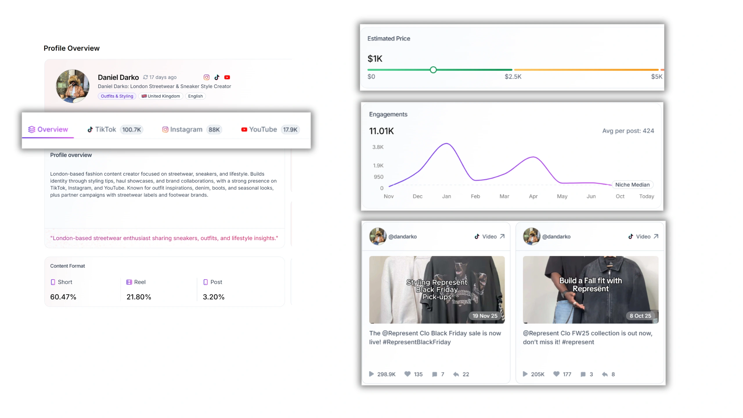 Example: You might find a creator like Daniel Darko who posts street style content, has 45K TikTok followers, and maintains 4.2% engagement—exactly the authentic creator you're looking for.