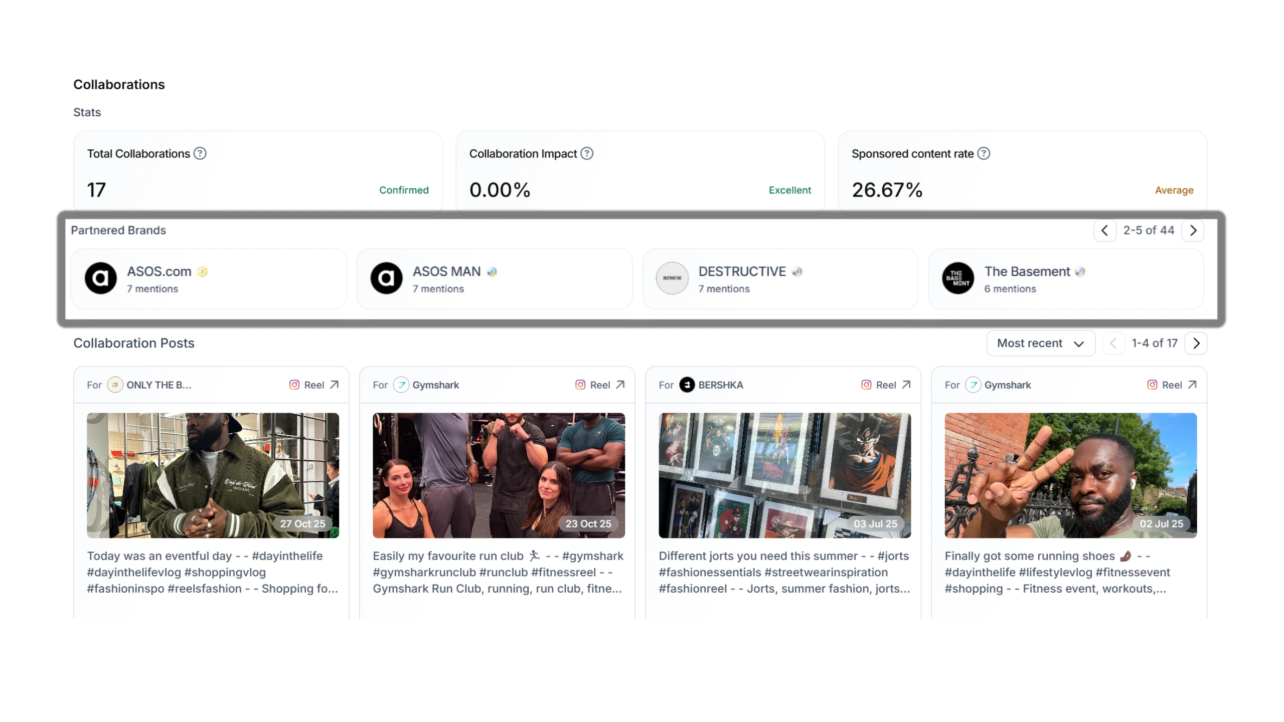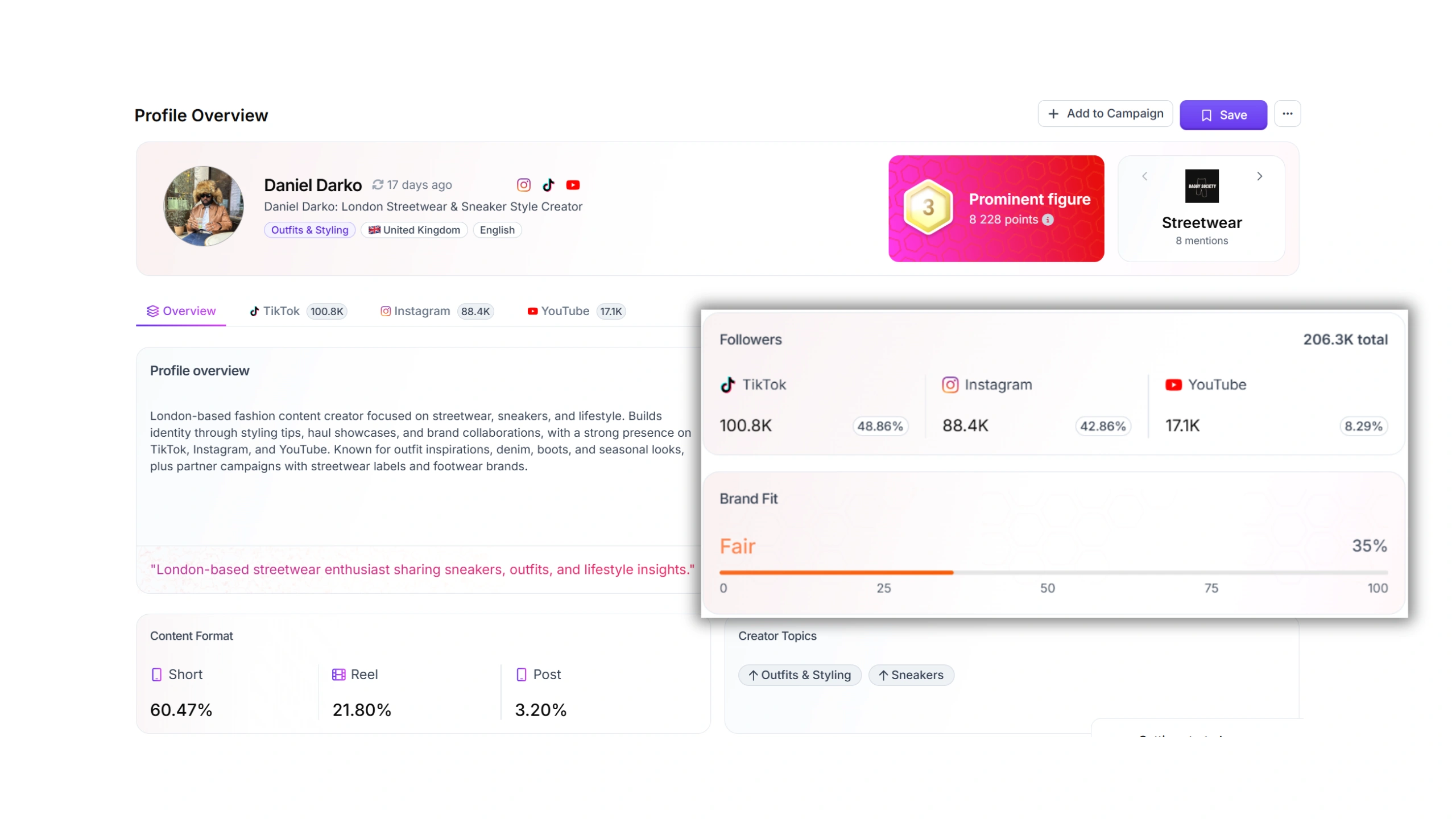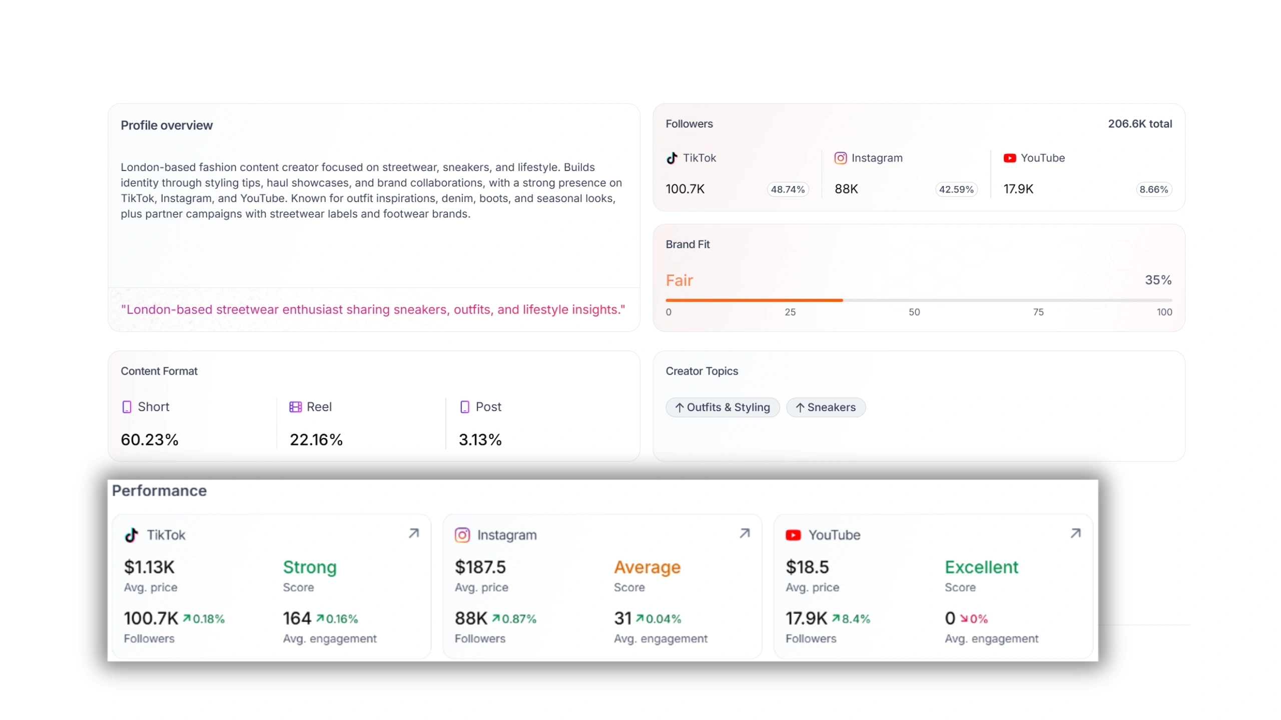 Example analysis: You find a creator who worked with streetwear brands like The Basement and Destructive. Their engagement is steady at 3.8%, and their audience is 72% US-based, ages 18-24. Their content style is raw, authentic, minimal editing—perfect for Levi's casual denim campaign.