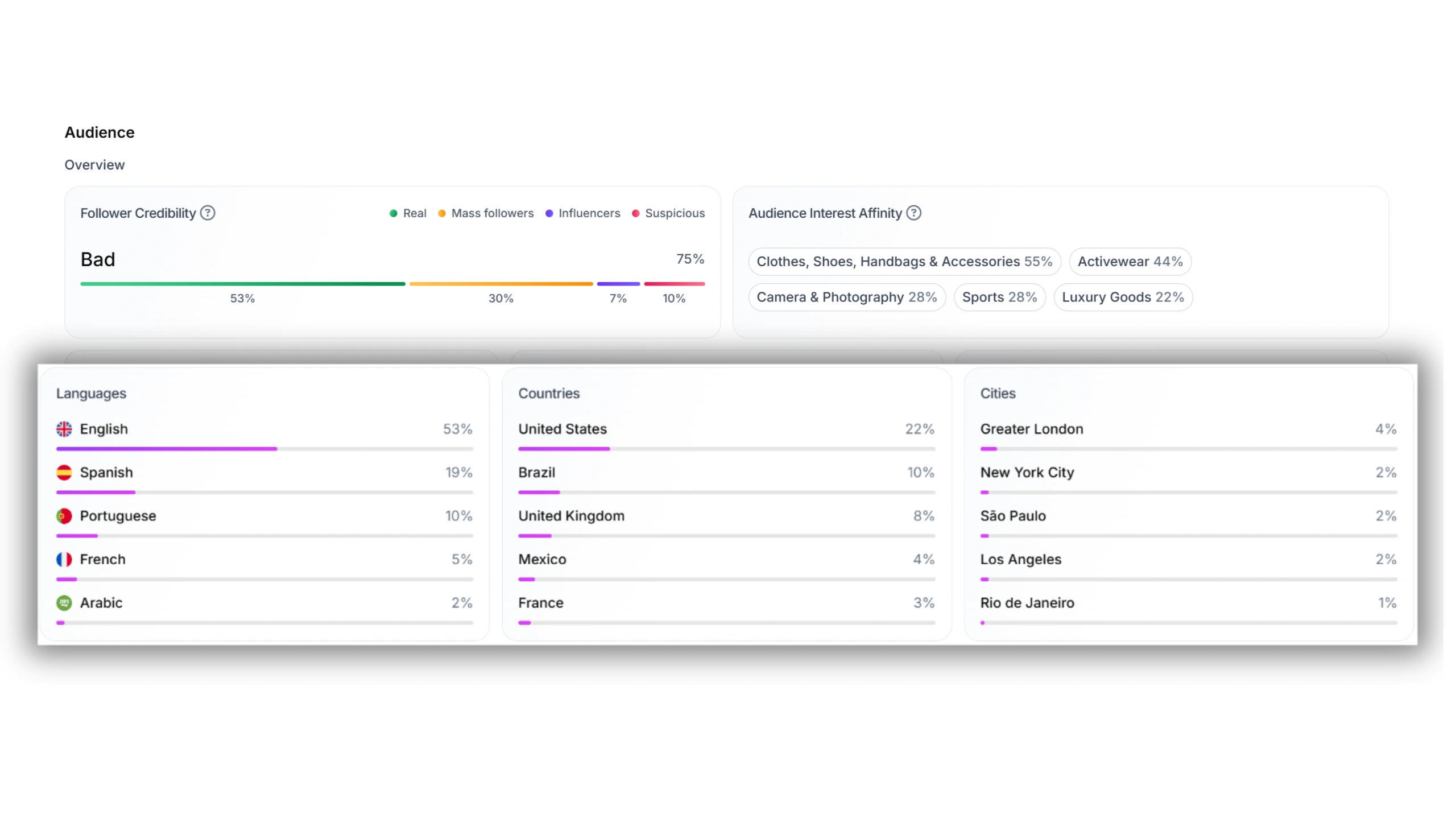 - Follower breakdown by country: If they claim to be US-based but 80% of followers are from Bangladesh, red flag
