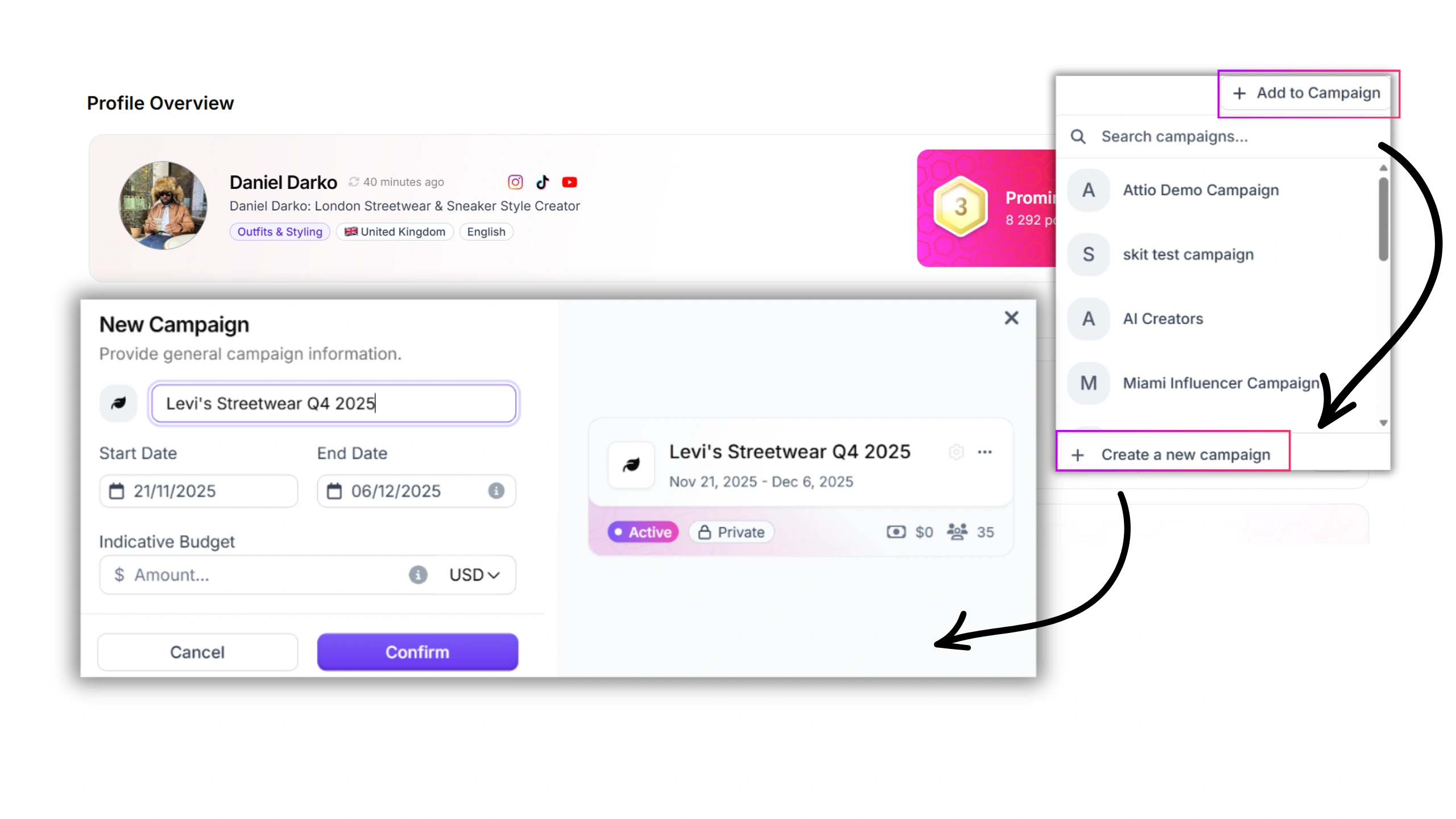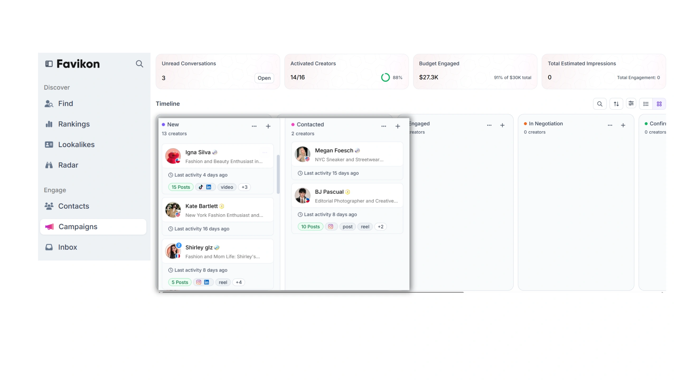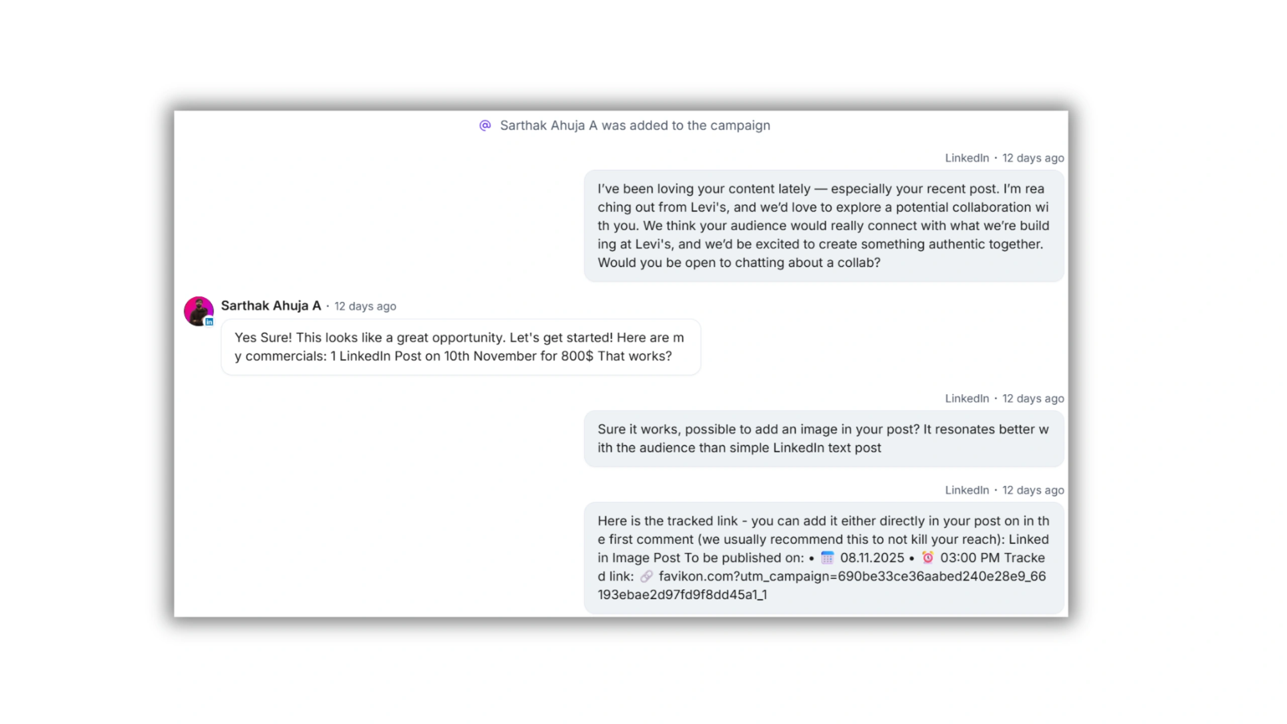 - Negotiation: Finalize deliverables and rates—auto-saved in campaign (10-15 min per creator)