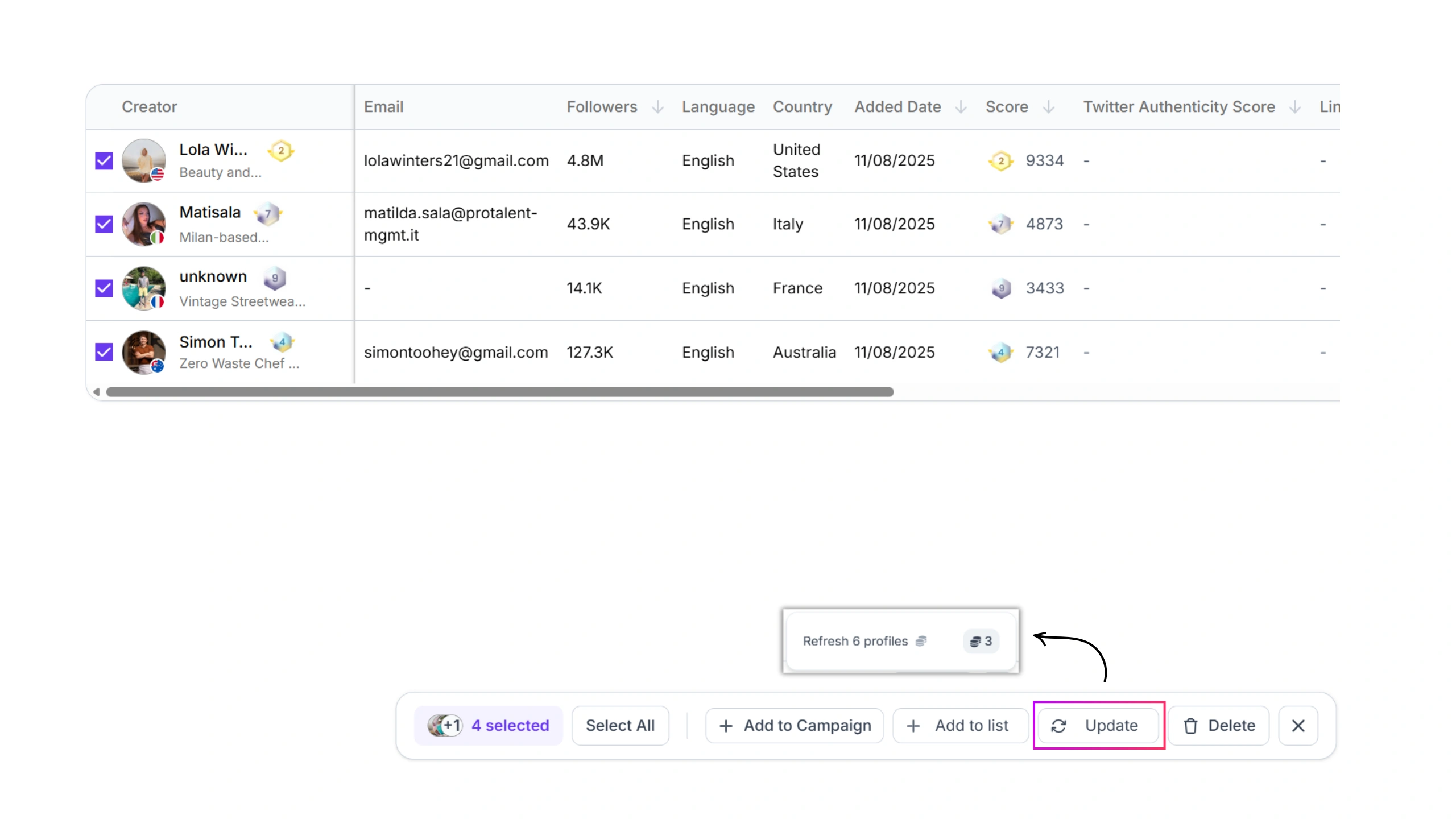 - Enrichment: Update creator data before outreach (30 sec per creator)