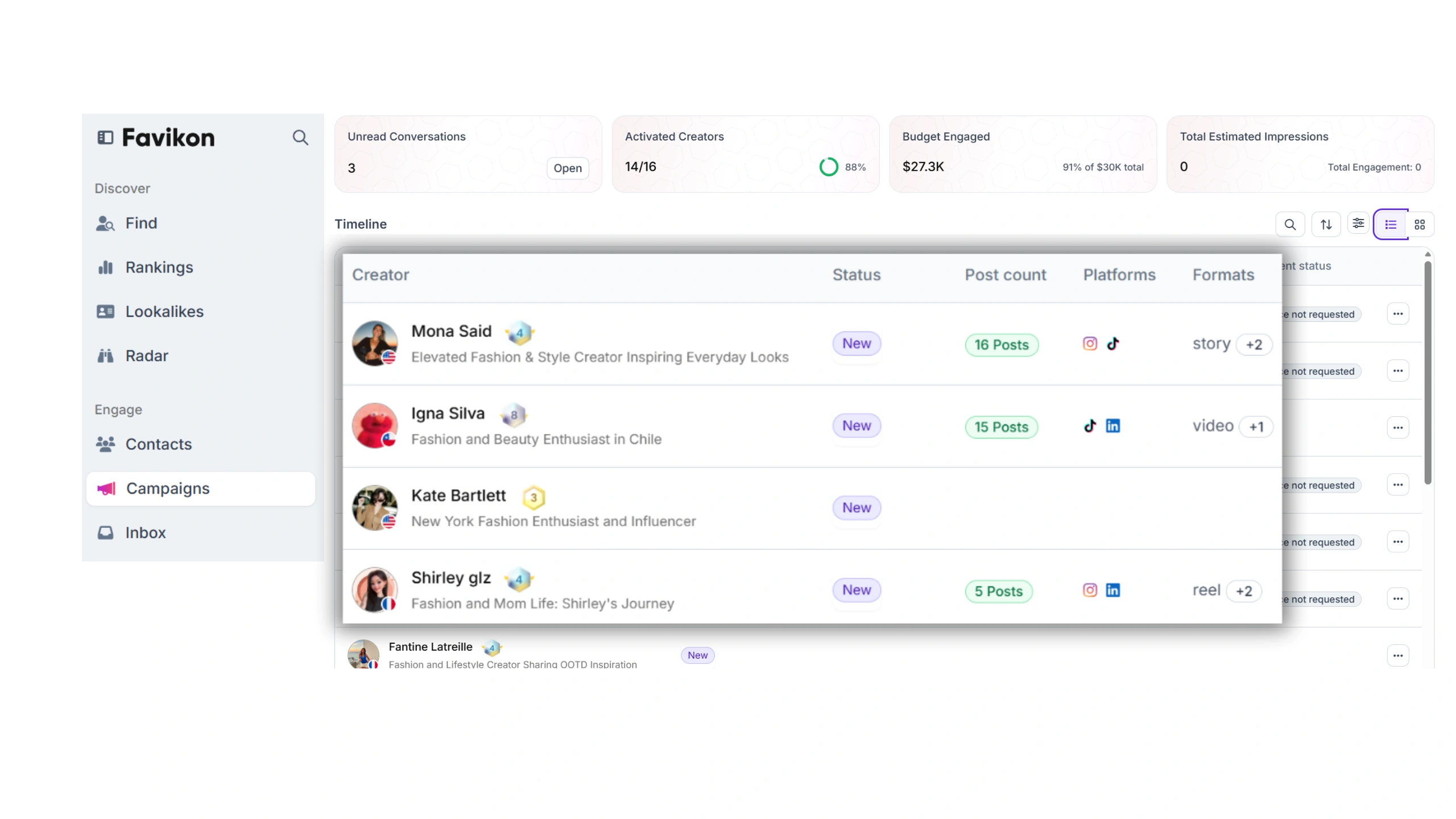 Example: A creator posts a TikTok with #LevisStreetStyle. Favikon detects it, adds it to your content calendar, and sends you a notification in the chat.