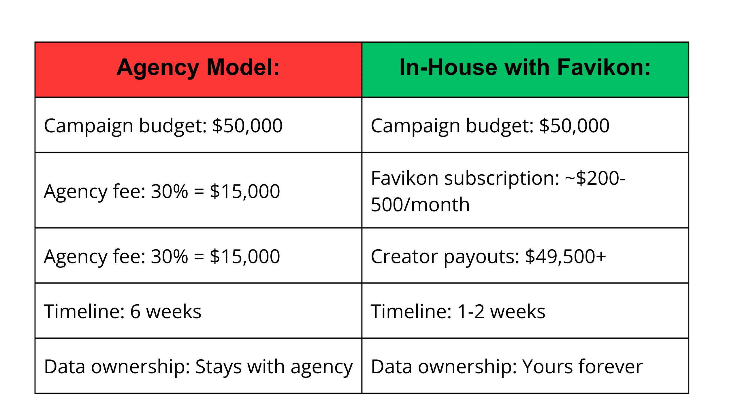 Net difference: You reallocate $14,500+ directly into creator budgets or save it. You move 3-5x faster. You own all campaign data and learnings.