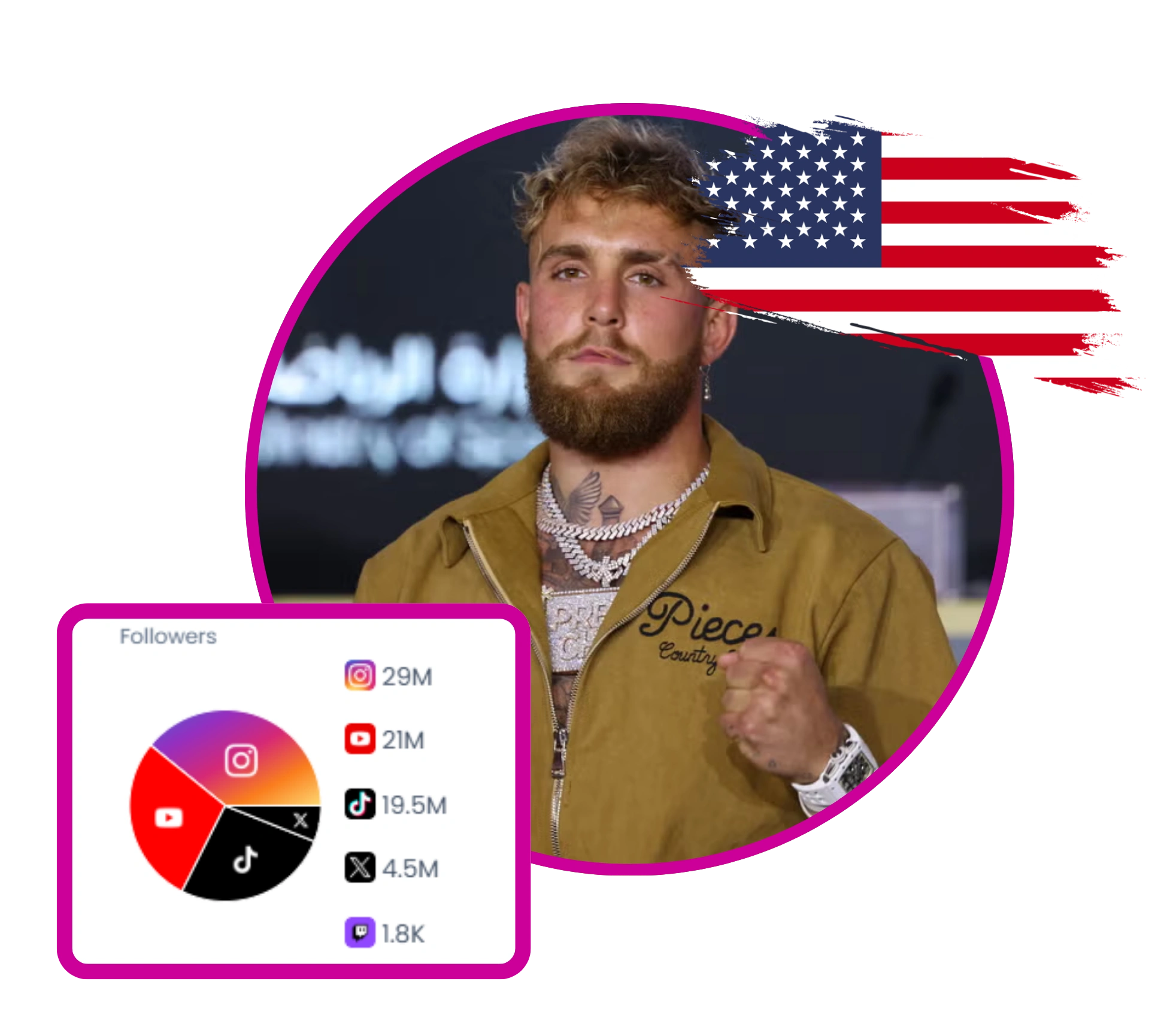 Jake Paul is a 29-year-old professional boxer and social media personality known for his boxing matches, lifestyle content, and entrepreneurial ventures. He frequently shares updates about his boxing career, personal life, and business projects, including his involvement with brands like Celsius and Betr. His content often features boxing training, fight promotions, luxury lifestyle displays, and collaborations with other athletes and influencers. Paul also engages his audience with personal stories, medical updates, and motivational messages, positioning himself as both an aspirational figure and a relatable peer.
