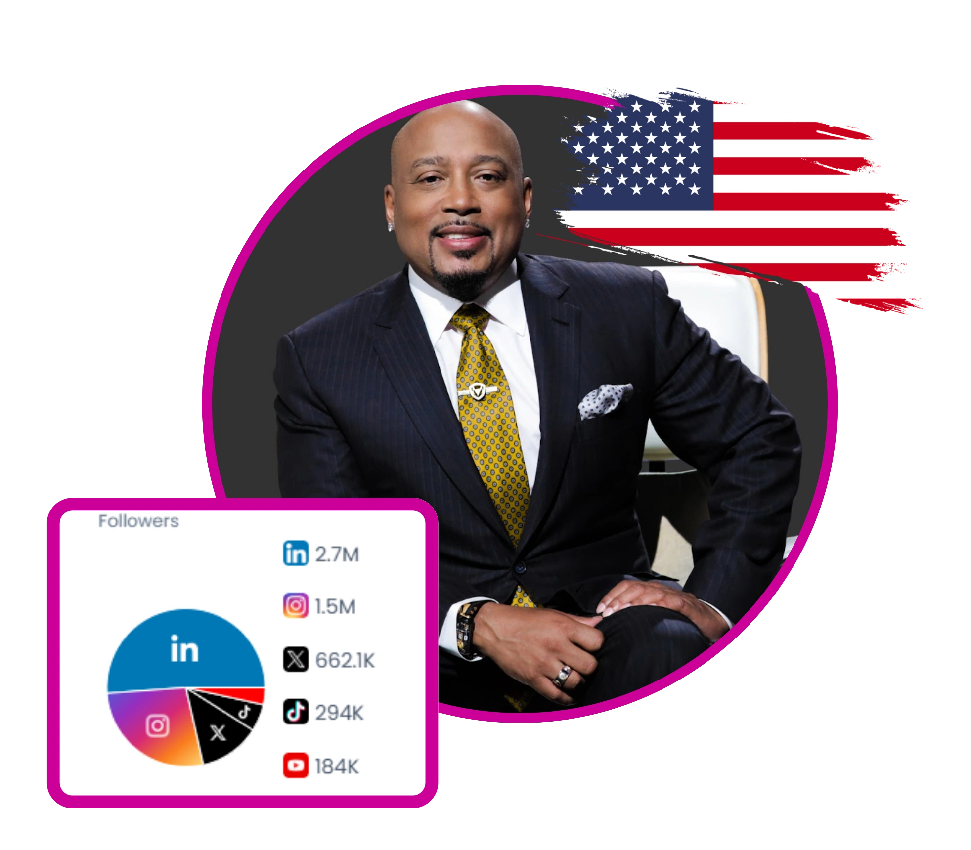 Daymond John is a US-based entrepreneur, FUBU founder, Shark Tank star, and branding expert. He coaches on brand building, business strategy, and motivational speaking, with a cross-platform presence on LinkedIn, YouTube, and Instagram.