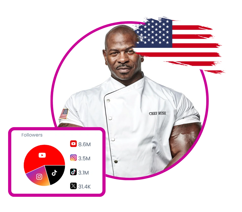 Chef Rush, known as the White House Chef, is a retired combat veteran and renowned chef. He uses his platform to advocate for mental wellness, military support, and suicide prevention, performing 2,222 push-ups daily to raise awareness. His content blends cooking, fitness, and motivational themes, often featuring challenges and collaborations. Chef Rush is also a master fitness trainer, emphasizing holistic health and mental stimulation through food and exercise.