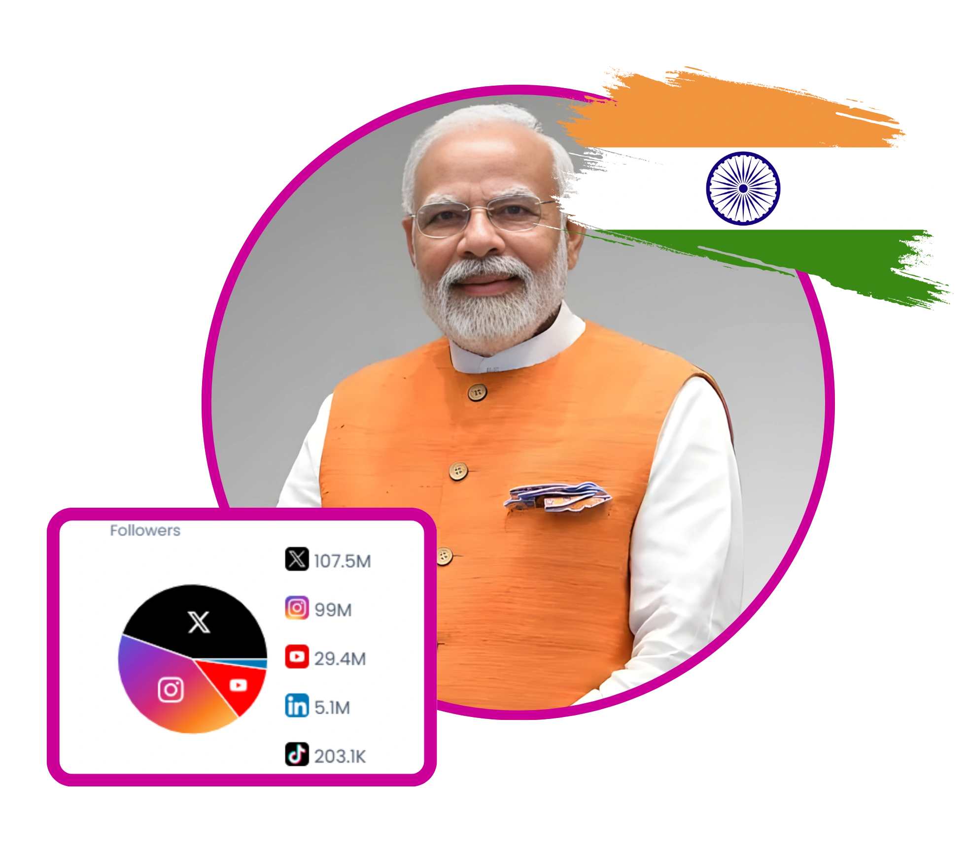 Narendra Modi is the Prime Minister of India, known for his active engagement on social media platforms. His content often highlights national achievements, cultural events, and international relations. Modi frequently congratulates Indian sports teams and scientists, showcasing his support for India's progress in various fields. He also pays homage to historical figures and promotes traditional Indian values. His posts reflect a strong sense of national pride and commitment to India's development.