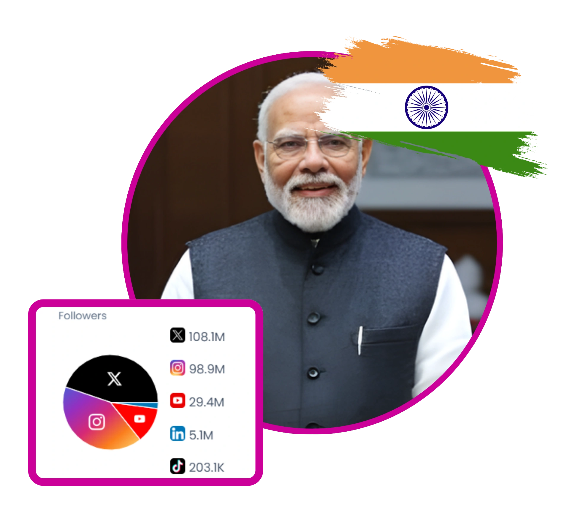 Narendra Modi is the Prime Minister of India, known for his active engagement on social media platforms. His content often highlights national achievements, cultural events, and international relations. Modi frequently congratulates Indian sports teams and scientists, showcasing his support for India's progress in various fields. He also pays homage to historical figures and promotes traditional Indian values. His posts reflect a strong sense of national pride and commitment to India's development.