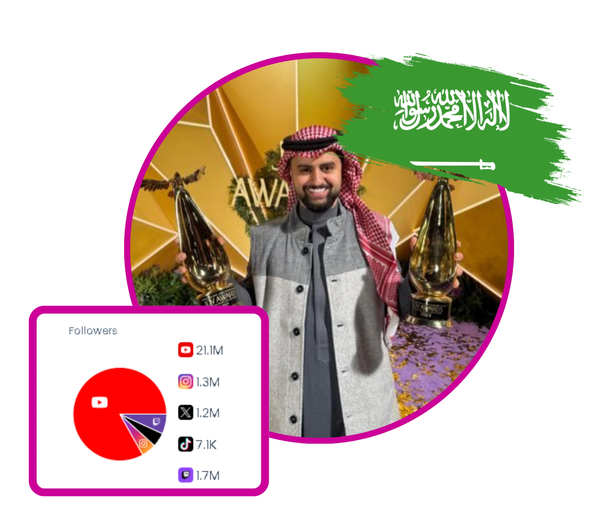 SHoNgxBoNg is a prominent Saudi Arabian content creator and streamer with over 17 million YouTube subscribers. He has won multiple awards, including Best Streamer and Best Content Creator in Saudi Arabia. His content primarily focuses on gaming, live streaming, and interactive challenges, often collaborating with brands like Nissan and Doritos. He engages with his audience through various platforms, including Instagram and Twitch, and is known for his entertaining and engaging style.