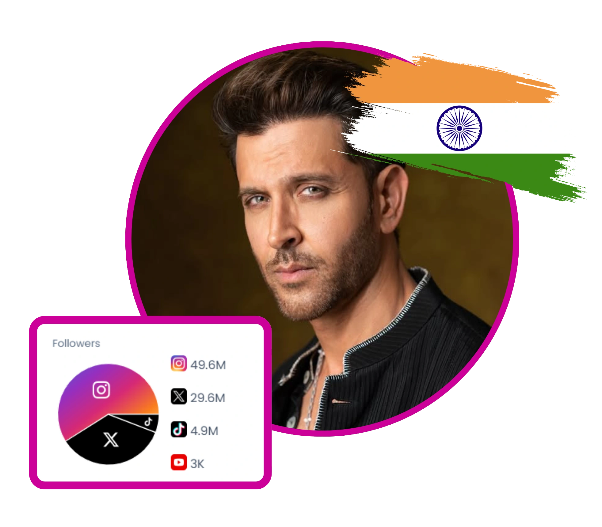 Bollywood superstar Hrithik Roshan with a global footprint across film, fashion, and lifestyle branding (HRX). Known for personal storytelling, fitness inspiration, travel, and luxury collaborations, with a strong multi-platform presence on Instagram, YouTube, and TikTok, blending entertainment with brand partnerships and motivational content.