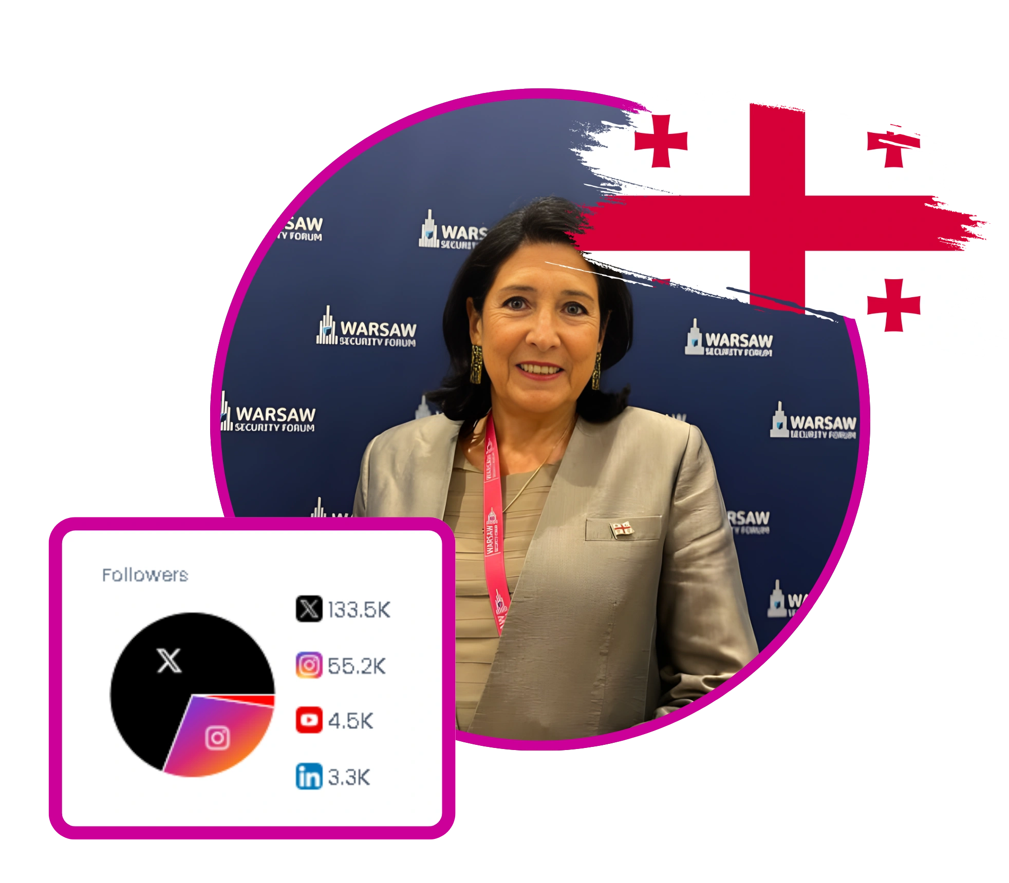 Salome Zourabichvili is the President of Georgia, known for her strong advocacy for human rights and corporate sustainability. With over ten years of experience in various sectors, she leads the UN Global Compact Network Georgia. Her social media presence focuses on Georgia's independence, European integration, and support for democratic values, often addressing political protests and international relations. She has been recognized in Forbes Georgia's 30 under 30 and is a Sakharov Fellow.