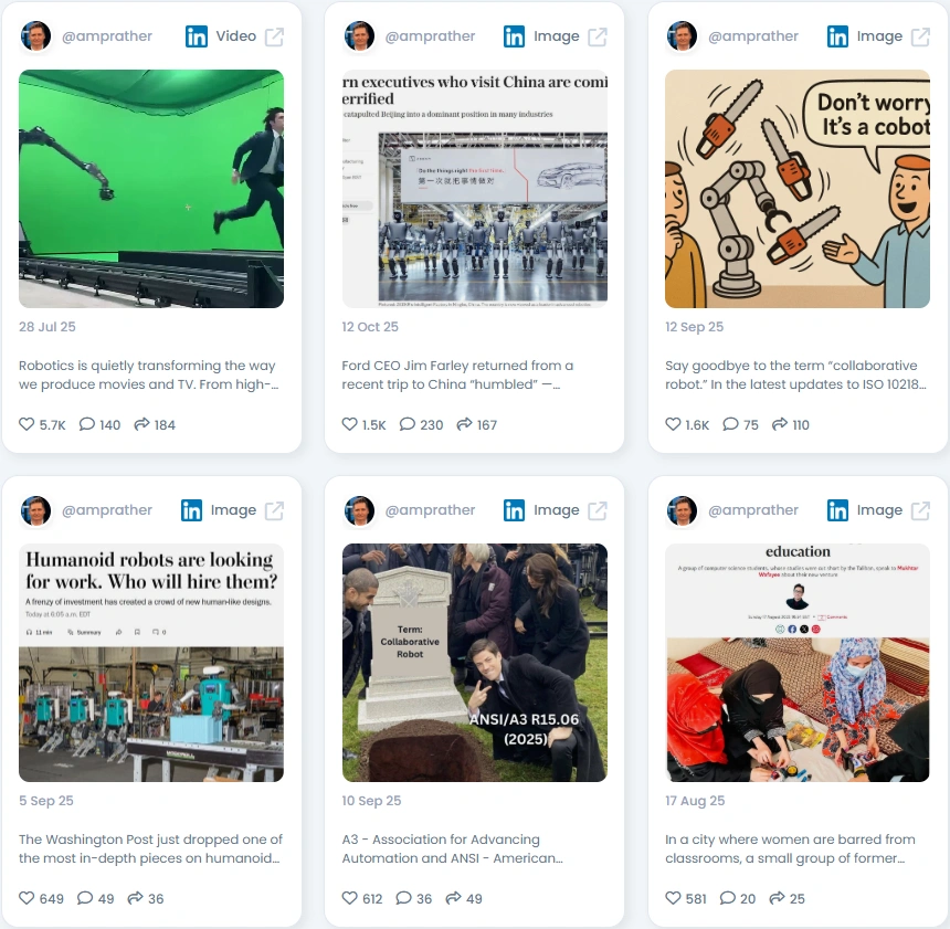 He explains what a rule change means on Tuesday morning in a factory. Posts break down topics like tactile sensing, embodied AI, and cobot terminology with plain language. He uses news, photos from site visits, and quick frameworks that stick. The tone is candid, curious, and laser-focused on practicality.