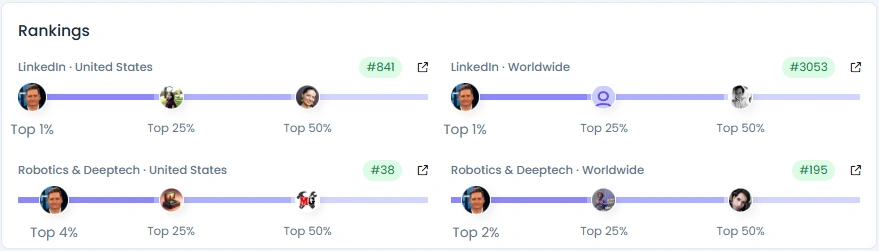 Aaron reaches about 79.9k followers on LinkedIn with healthy two-year growth from 57.9k. He posts at a very active rhythm near 54 times per month and engagement sits at very good. His Influence Score is 7,870 points. Rankings place him top 1 percent on LinkedIn in the United States (#197) and top tier in Robotics and Deeptech in the US (#38) and worldwide (#195).