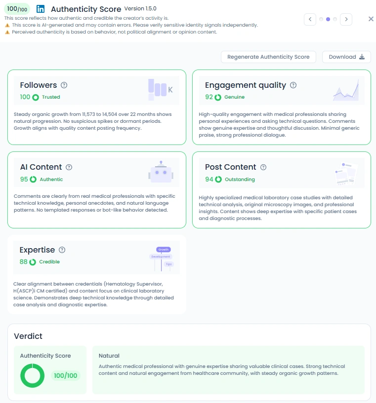 Favikon scores Abdulaziz 100 out of 100 for authenticity. His activity shows genuine professional interaction, original microscopy images, and hands-on case discussion. Comments are technical and engaged, reflecting peer learning rather than superficial praise. That pattern signals a practitioner who shares real expertise rather than curated PR.