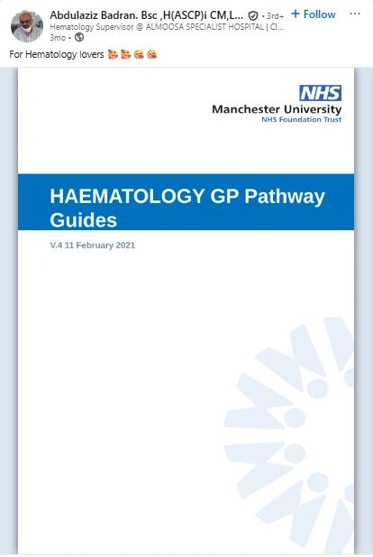 Abdulaziz connects with hospitals, clinical labs, medical educators, and diagnostic vendors. His posts reference institutional materials and international resources such as NHS pathway guides and industry atlases. He engages with clinicians, laboratory scientists, and suppliers, which gives his content cross-border professional credibility and practical reach.