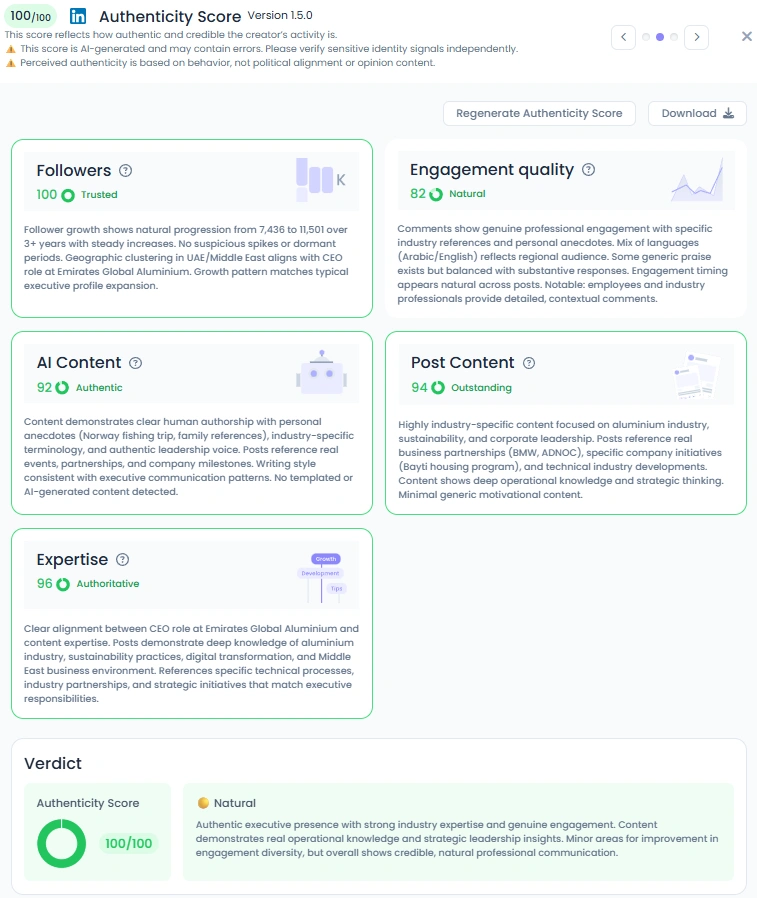 With a 100/100 Authenticity Score, Abdulnasser stands out for his transparent and grounded communication. His content combines real-world anecdotes with industry-specific expertise, showing that leadership is built on both experience and empathy. His posts highlight genuine company milestones and personal moments, without relying on motivational clichés. The result is a digital presence that feels sincere, insightful, and deeply connected to the values of the UAE.