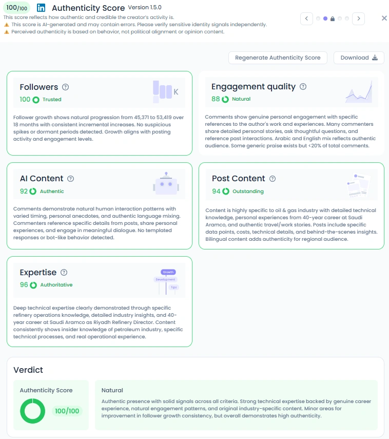 With an Favikon Authenticity Score of 100/100, Abdulrahman represents the gold standard of credibility. His Engagement Quality score of 88 confirms a deeply connected community that engages thoughtfully with his posts. His bilingual storytelling creates natural authenticity, inviting readers into his world of leadership and service. Every post reflects lived experience, gratitude, and humility. It’s no surprise that his audience trusts him not only as a professional voice but as a mentor who genuinely cares.