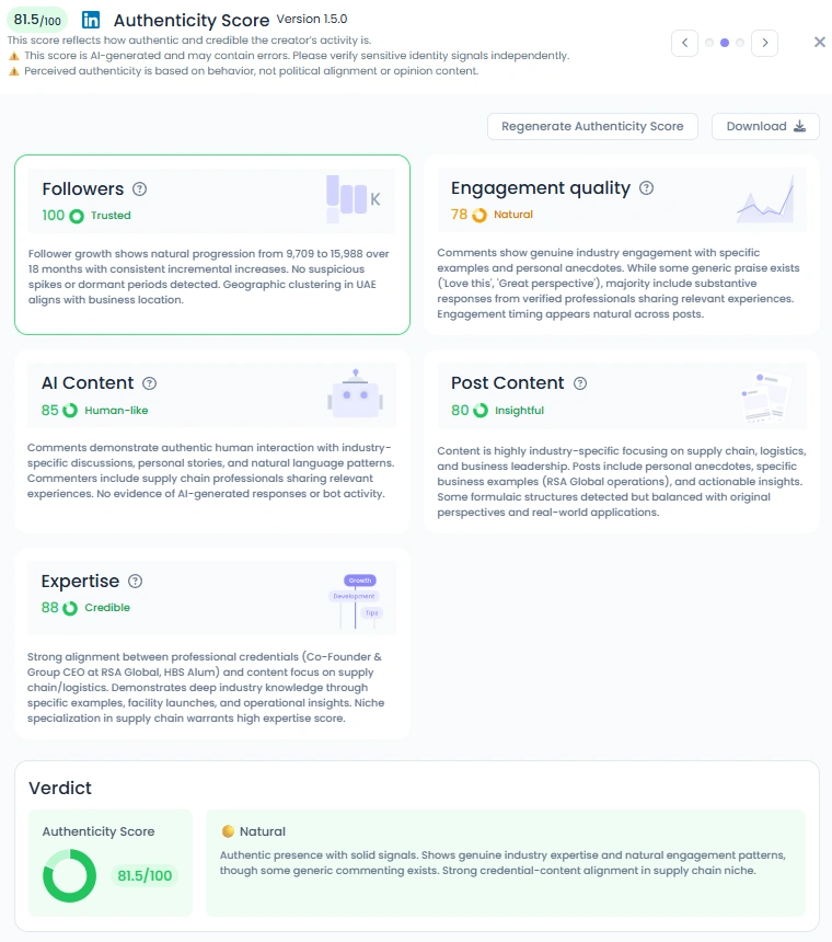His Favikon Authenticity Score is 81.5/100. Comments show real professionals swapping examples from their own ops. Posts mix personal moments with business milestones like site visits, team wins, and launch days. The voice is consistent and human with no trace of automated patterns. He balances authority with humility which builds trust.