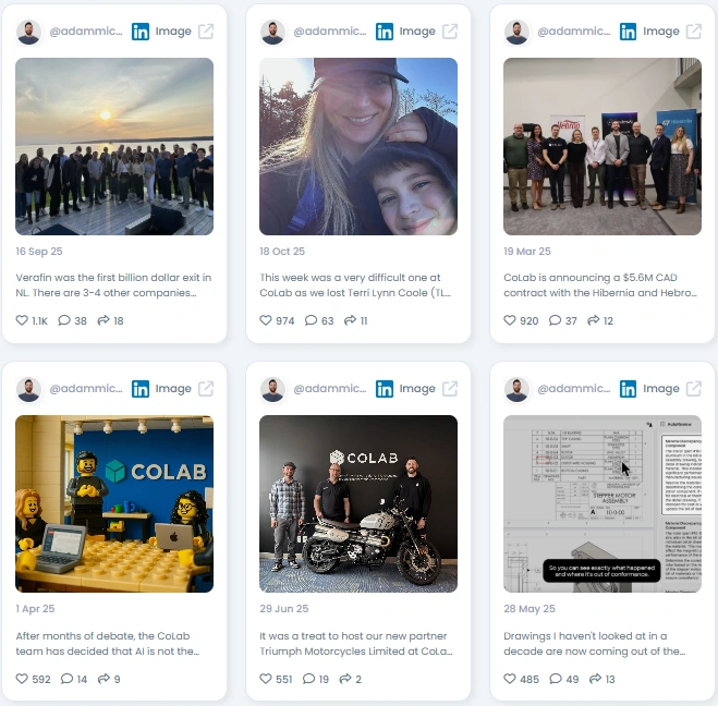 CoLab’s customer and partner list spans complex industries where engineering speed and quality decide outcomes. Recent highlights include the $5.6M CAD work supporting the Hibernia and Hebron projects, plus partnerships in motorcycles and advanced manufacturing. Adam often brings customers into the story with case style posts, on site photos, and learnings from deployments. The result is a living portfolio that shows adoption and impact.