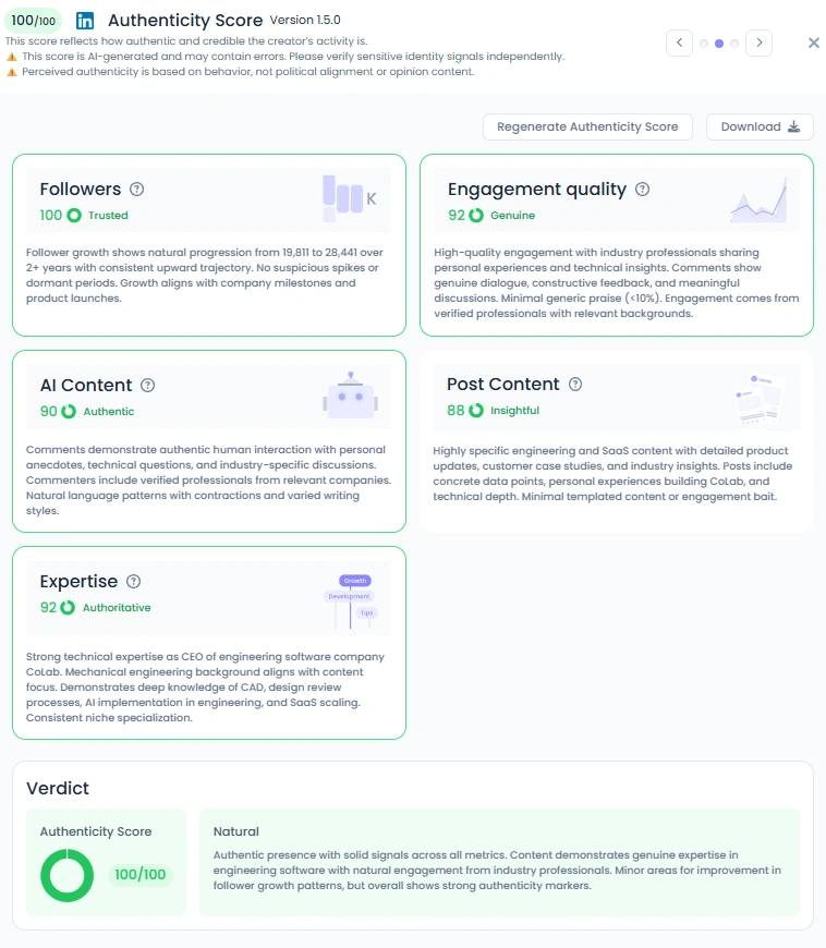 Favikon rates his presence at 100 out of 100 for authenticity. Engagement looks genuine and driven by industry professionals. His posts blend personal moments with product specifics, which keeps the signal high. You see real photos, team shoutouts, and concrete change logs rather than templated slogans.