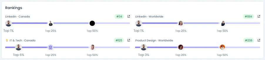 Followers grew from 19,811 to 28,441 in a little over two years with a natural curve. Engagement quality 92, AI content 90, Post content 88, Expertise 92. Influence Score sits at 6,790 points, with rankings such as #34 in LinkedIn Canada, #125 in IT and Tech Canada, and #238 in Product Design worldwide. Posting rhythm is steady and tied to product milestones, partnerships, and customer stories.