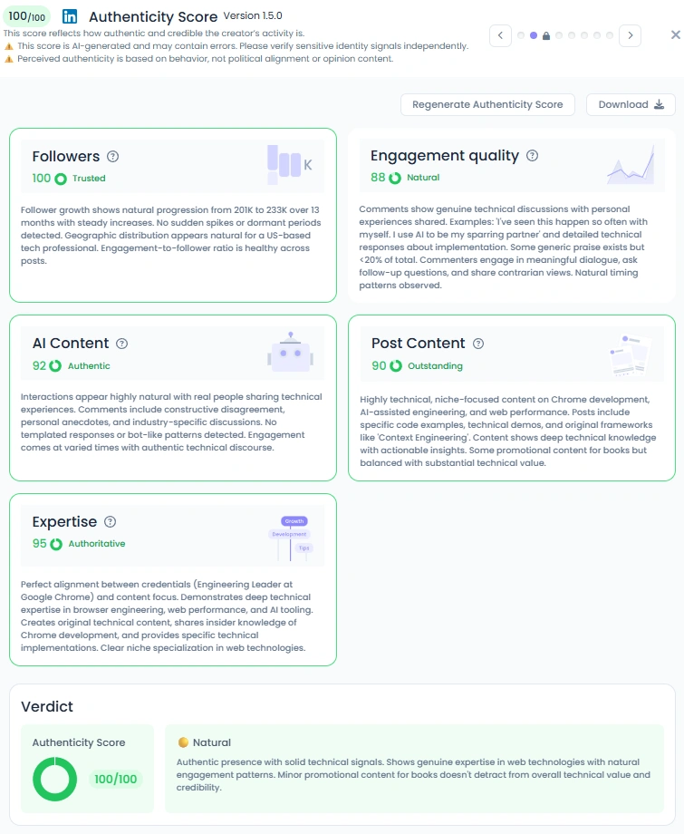 Favikon scores him 100/100 on Authenticity. Engagement quality is 88 Natural, with real engineers trading notes and pushing back when needed. AI Content rates 92 Authentic, and Post Content lands at 90 Outstanding. The pattern matches a practitioner who shares real code, real data, and real trade-offs.