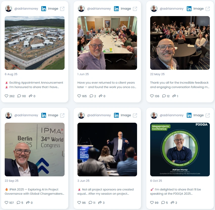 Adrian’s network includes global governance institutions, consultants, and thought leaders who shape the standards of modern project management. His close alignment with the P3GQA community connects him to influential organizations and senior practitioners worldwide. Whether speaking at international events or collaborating with governance associations, Adrian’s circle reflects deep professional respect and authority within the global project governance ecosystem.