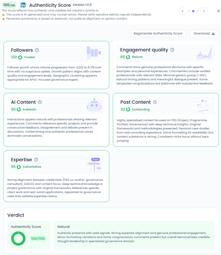 Adrian’s growth is consistent and transparent. His following rose from 3,500 to 8,700 professionals over time, with no spikes or artificial boosts. He ranks in the top 2% on LinkedIn in Australia and top 10% worldwide in Project Management. With an Influence Score of 4,124 points and engagement quality rated at 88, his metrics confirm his credibility as a trusted expert. His post content scores 92, reflecting his ability to merge expertise with clarity.