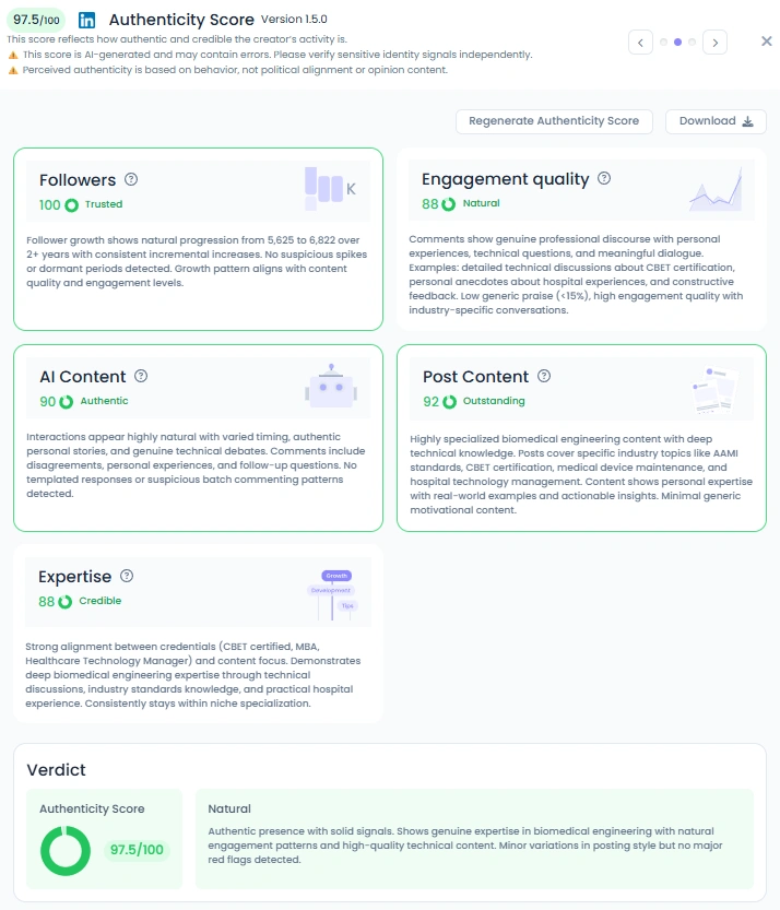Favikon gives Aisha a 97.5/100 Authenticity Score, reflecting clear, professional signals across her activity. Her content shows consistent, organic growth and meaningful engagement. She shares technical diagrams, certification news, and photos from events, which creates trust. Comments often include detailed technical questions and practitioner feedback rather than generic praise. That pattern shows she’s building a technically literate and engaged community.