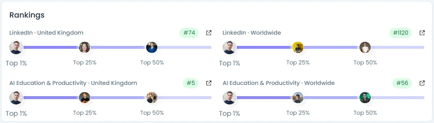 Alex’s influence is reflected in his 8,399 Influence Score and strong community of over 174,000 followers across platforms. Ranked in the Top 1% of LinkedIn creators in the UK and Top 1% in AI Education and Productivity worldwide, he drives impressive engagement across both LinkedIn and X. His posts frequently reach tens of thousands of views, and his videos consistently spark industry conversations. His follower growth remains steady, backed by organic reach and a loyal tech-savvy audience.